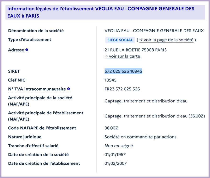 Exemple : le numéro SIRET de VEOLIA